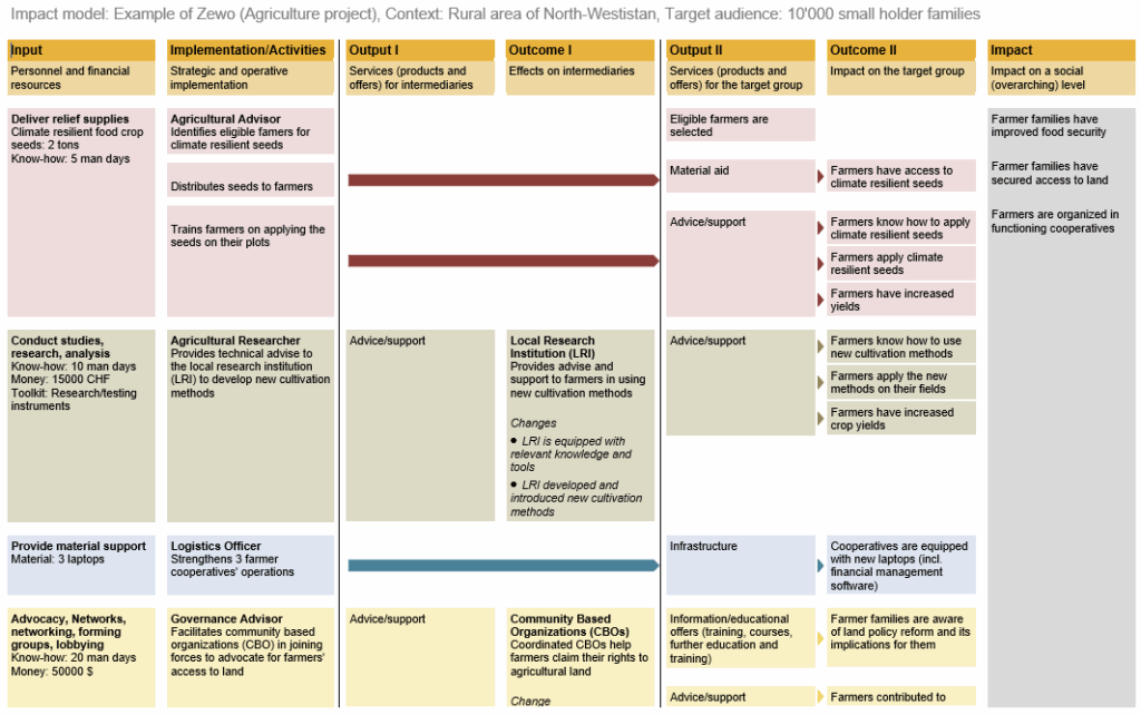 An impact model outlines the intended effects of a particular intervention and how these effects should be brought about. It clarifies what should change and how this shall be achieved. The impact model provides charities with a framework to monitor and evaluate whether their initiatives have been effective and meaningful. It helps them to find out whether the underlying theory of change with its assumptions about causes and effects was designed appropriately.
