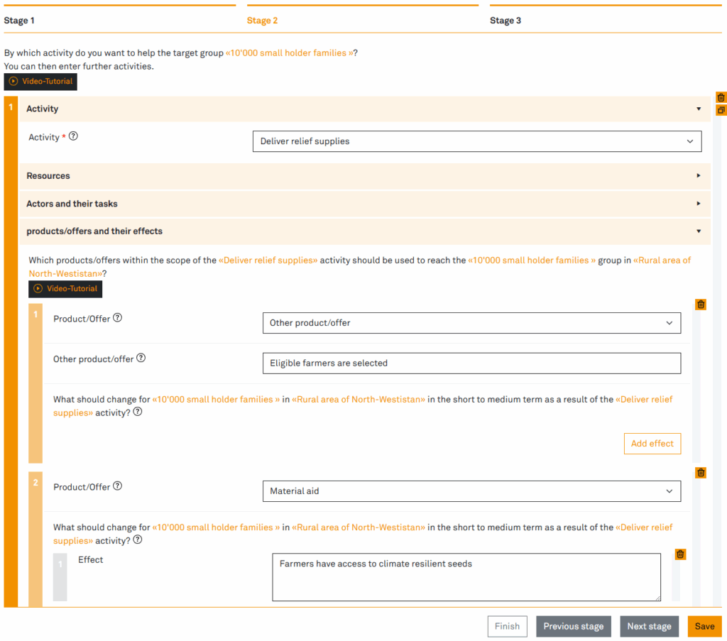 Answer a couple of questions to describe what your organization does or plans to do and what effects it hopes to achieve through its activities. The questions develop dynamically. This means that your answers will produce the subsequent questions. Selection menus and examples simplify your entries.