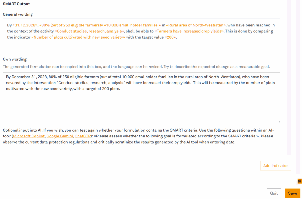 The tool asks you the questions to define indicators and measurable effects of your impact model. Based on your answers, it will suggest a wording for a measurable goal. Adjust the wording, if necessary. Then do the SMART check – even it’s just for fun. The AI application of your choice facilitates assessing whether your goal meets the SMART criteria and points out possible improvements.