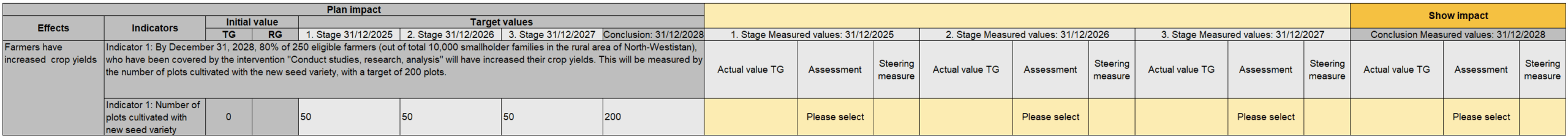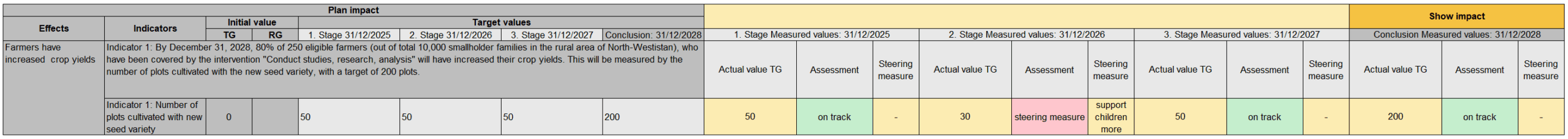 Include the completed progress table in your report. On this basis, describe the findigns in the narrative section of the report and explain the steering decisions as well as their effects on the further course of the intervention. This way you make the most of your progress table ensuring that both your intervention and your report are impact-oriented,