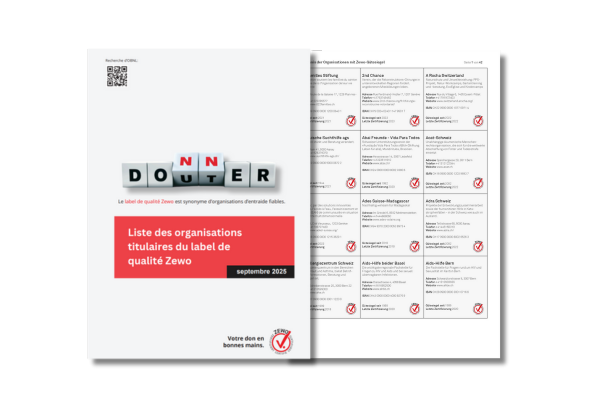 Zewo est l’organisme suisse de certification qui garantit que les organisations d’entraide travaillent de manière responsable et transparente. Avec une organisation certifiée Zewo, vous pouvez être sûr que votre don est utilisé de manière efficace.